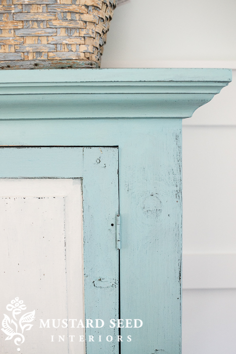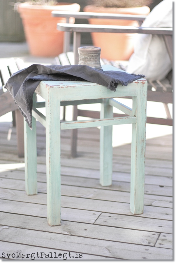 Þar sem Eulalie´s sky og Linen eru litir mánaðarins hjá Miss mustard seed´s valdi ég þá tvo liti á þennan gamla sjarmerandi koll sem ég málaði og er fullkomin sem lítið nett borð til að leggja kaffibollann á. Lítill gamall sjarmur.