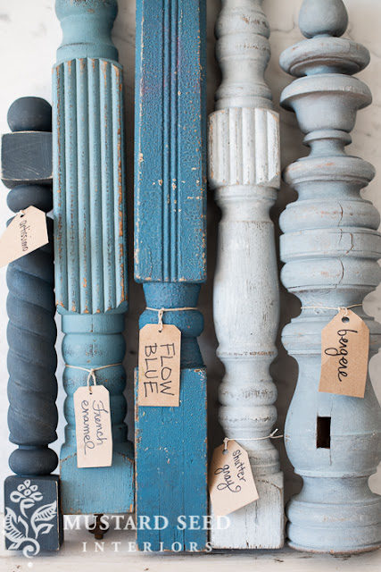 Hér er Shutter Gray með öllum bláu litunum í Milk paint línuni og hann virkar frekar grár við hliðina á litnum Flow Blue sem er mjög ákveðin blár litur... ekkert hik þar á ferð.
