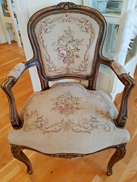 Hugmyndin er að halda í fallega áklæðið og sníða stólinn að ljósum og rómantískum stílnum sem einkennir Blúndur og Blóm og heimili Kikku.